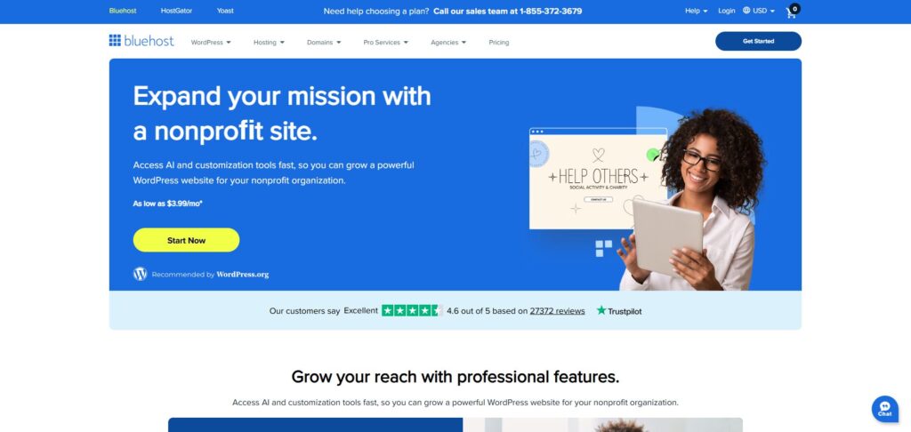 Bluehost is a top-rated hosting provider for nonprofits, known for its balance of affordability, performance, and ease of use. Bluehost offers three shared hosting plans starting at $3.99 per month, which include a free domain, SSL certificate, and unmetered bandwidth.